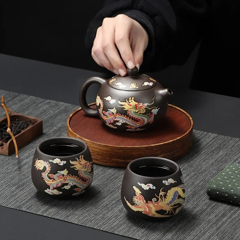 Produzido com a autêntica argila roxa de Yixing, este trabalho artesanal carrega séculos de tradição e refinamento. Cada peça é moldada à mão por artesãos experientes, garantindo um acabamento único e duradouro. Os delicados símbolos de dragão e fênix, presentes no design, representam prosperidade, harmonia e equilíbrio, tornando o item não apenas funcional, mas também um amuleto cultural repleto de significado.