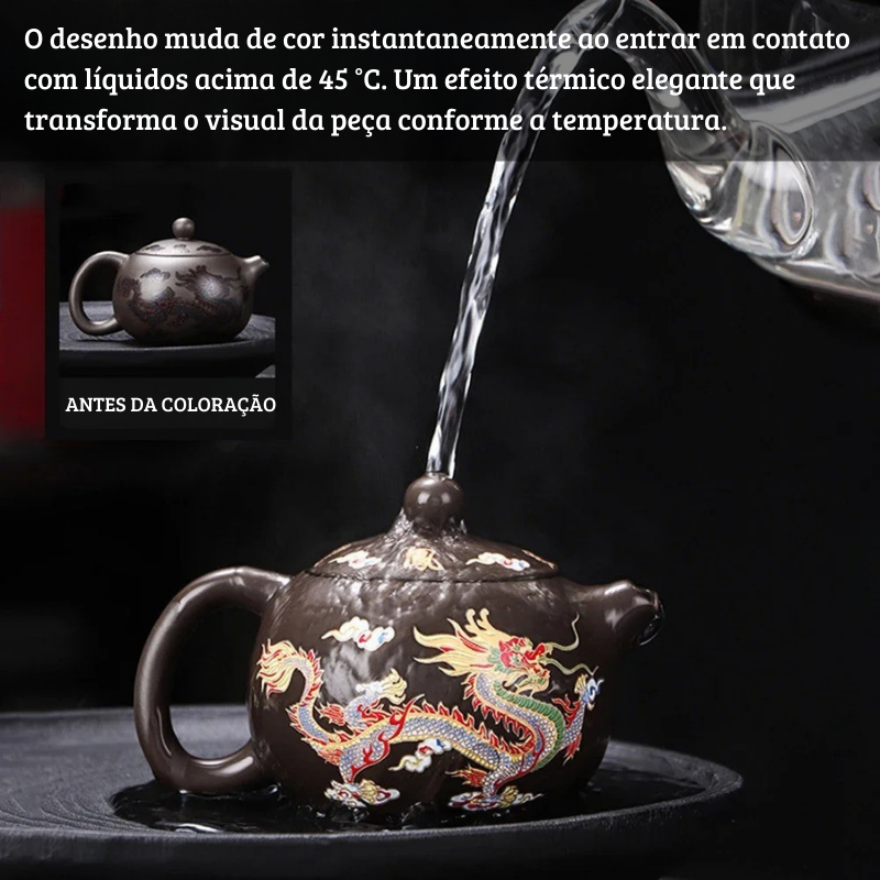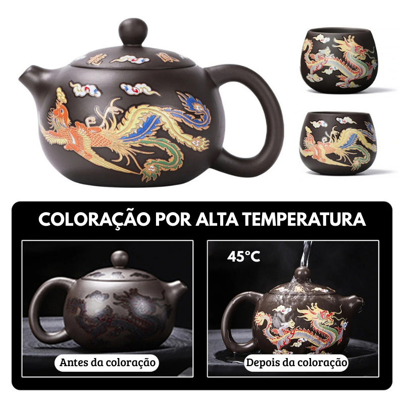 O padrão delicado de dragão e fênix ganha vida diante dos seus olhos: ao receber água quente, as cores se transformam suavemente, criando um espetáculo visual que torna cada preparo ainda mais especial.