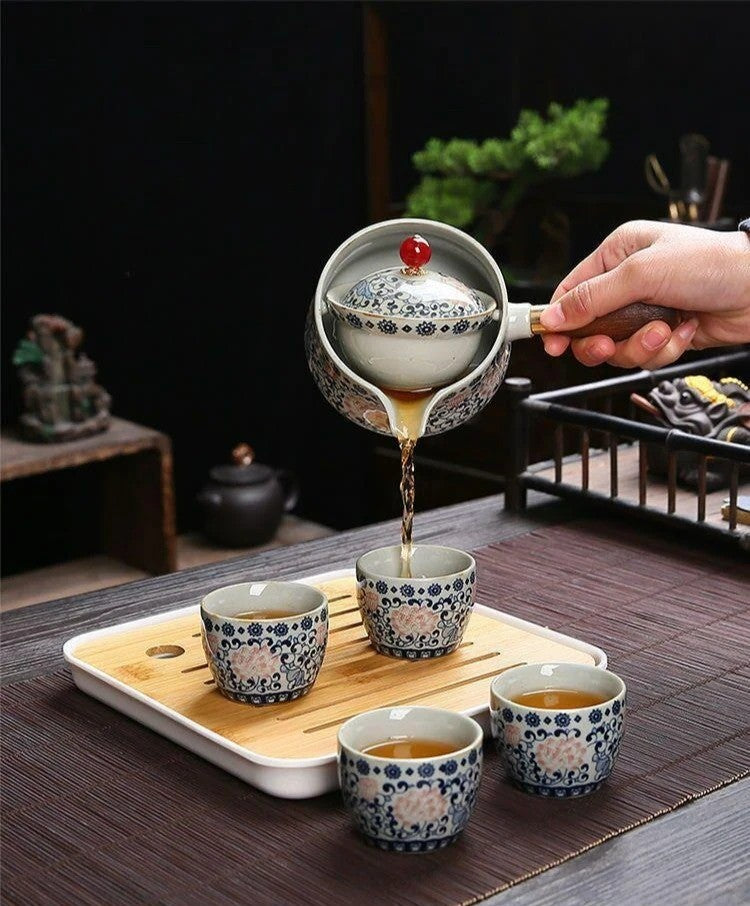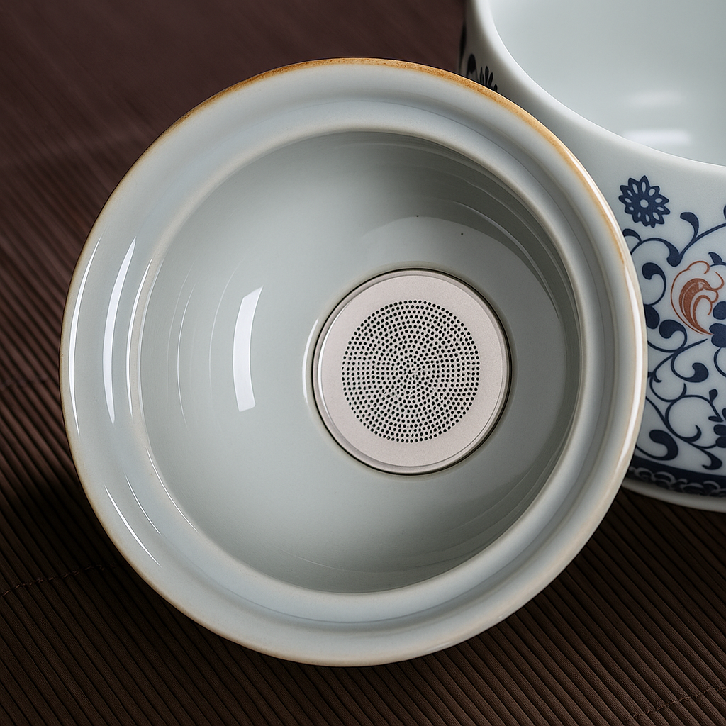 O azul profundo e o rosa delicado na pintura remetem à tradição milenar da porcelana chinesa. Já o infusor rotativo embutido é um aceno à praticidade silenciosa dos dias modernos.
