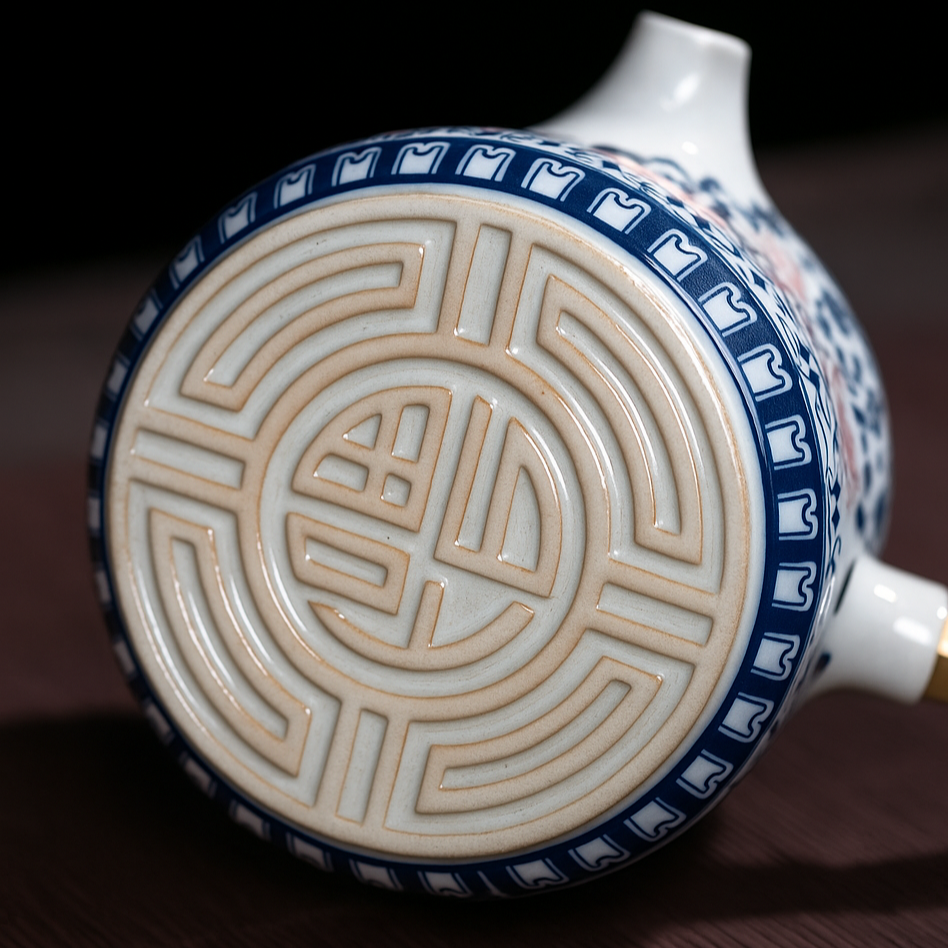 A base do bule é delicadamente moldada com um caractere tradicional do mandarim “福” que simboliza sorte e felicidade.