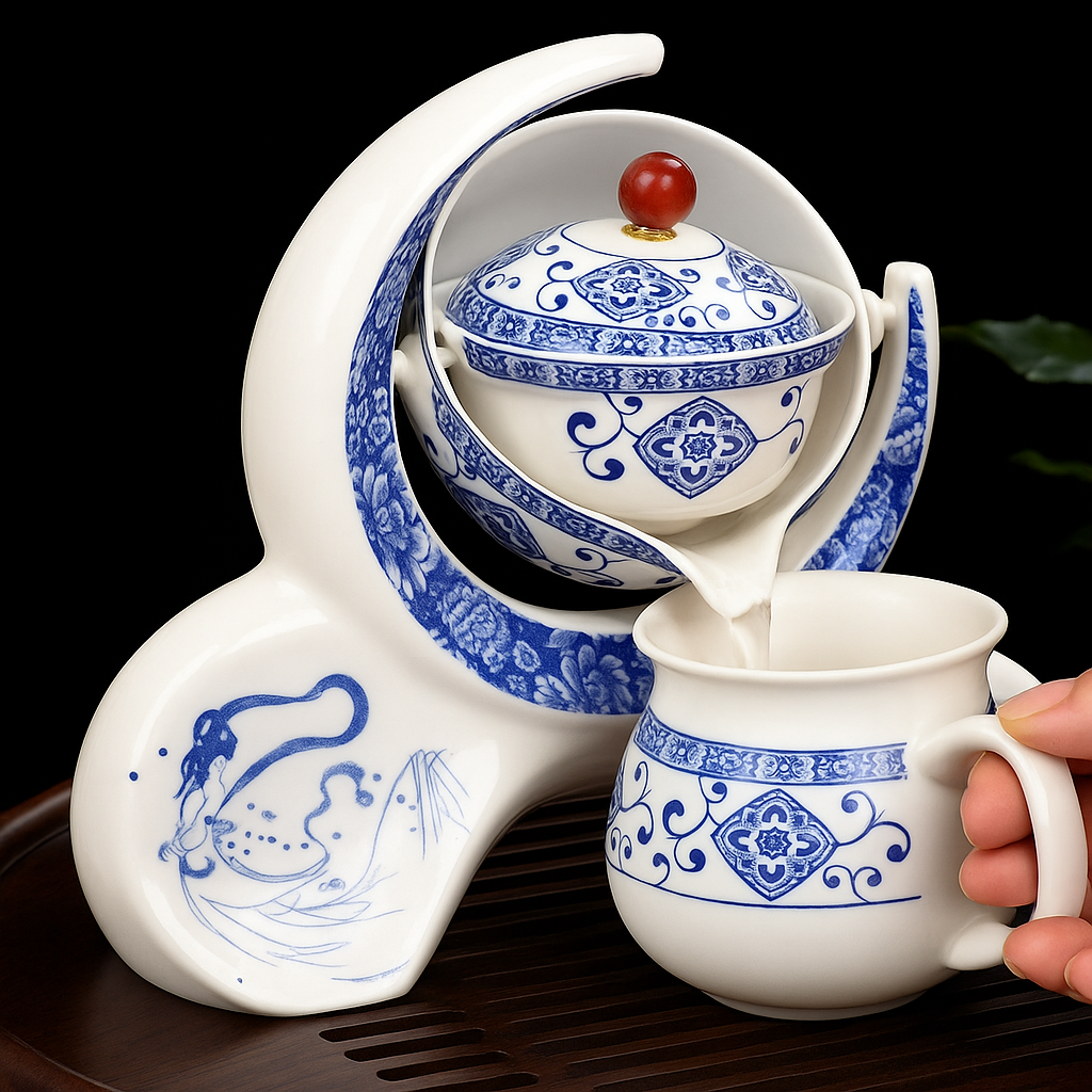 - Base cerimonial em lua: sustenta o Gaiwan e controla o momento de servir.