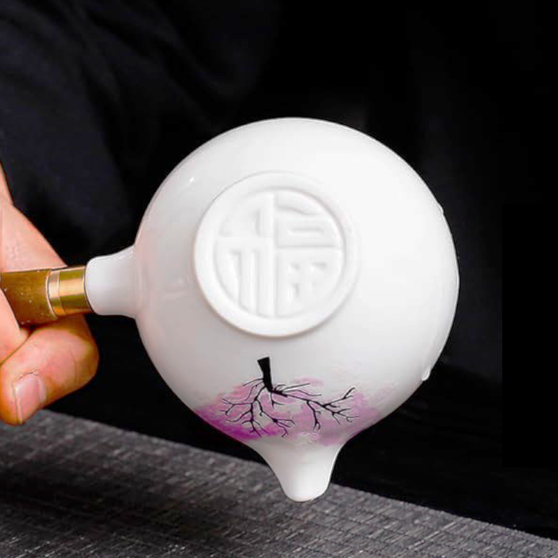 A base do bule é delicadamente moldada com um caractere tradicional do mandarim “福” que simboliza sorte e felicidade.